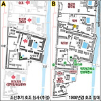 ※ 지난해 11월에 올렸던 동일한 제목의 1편, 그리고 지난 2월에 올린 2편에 이어지는 호조 관아 건물 배치에 관한 마지막 글입니다. 코로나19 이전의 시기가 요원한 때입니다. 여기에 이런저런 일이 더해져서 본편의 편집이 더 늦어졌습니다. 기다려 주신 분이 계신다면, 그저 감사드릴 뿐입니다. ※ 같은 제목의 글 2편(링크)에서 이어지는 내용입니다. 위 17번 이미지의 A 평면도는 1편과 2편 글에서 다뤘던 내용에 기반하여 추정한 조선시대 후기의 호조(戶曹) 청사 건물 배치도이다. 호조와 같이 육조거리(세종대로) 동쪽 편에 있었던 이조(吏曹), 한성부(漢城府), 농상공부(農商工部)의 대청(大廳) 건물이 위 그림에서 보는 것처럼 육조거리 방향, 즉 서쪽 9시 방향을 향하고 있는 것과 비교할 때, 호조 청사..